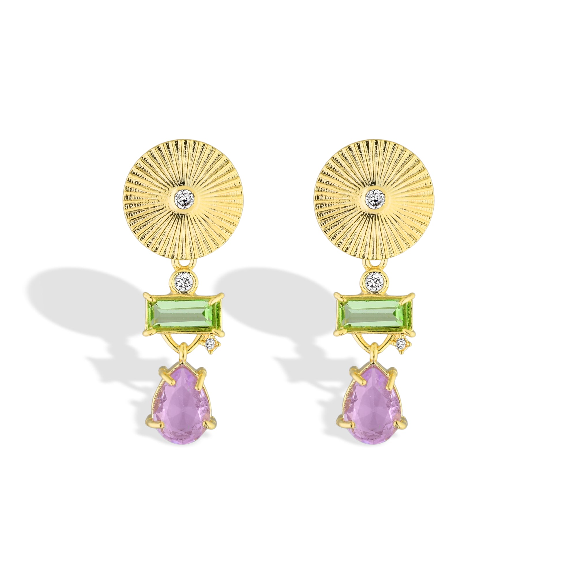 The Lumière Duo Earrings balance texture and color with refined precision. The radiant top contrasts with the green baguette and lilac drop, creating a contemporary and polished design. The combination of shapes, enhanced by cubic zirconia, results in earrings that are elegant and full of character.