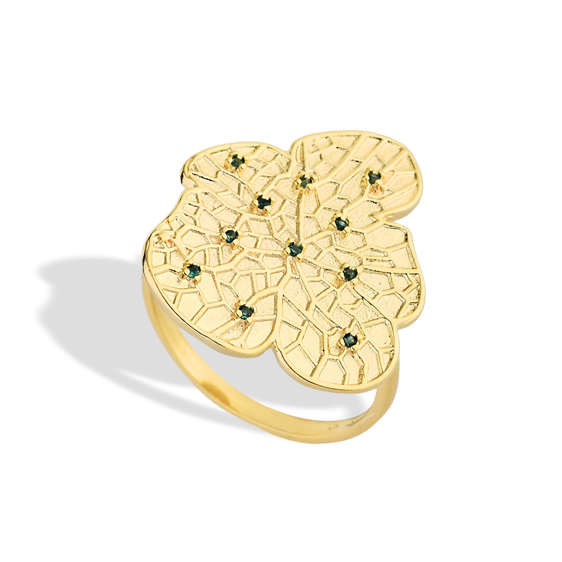 Inspired by the beauty of natural forms, the Verdant Leaf Ring blends organic texture with delicate green cubic zirconia, evoking life, freshness, and renewal. Each detail is sculpted to reflect nature’s elegance in its most refined expression. A true charm filled with energy and grace.